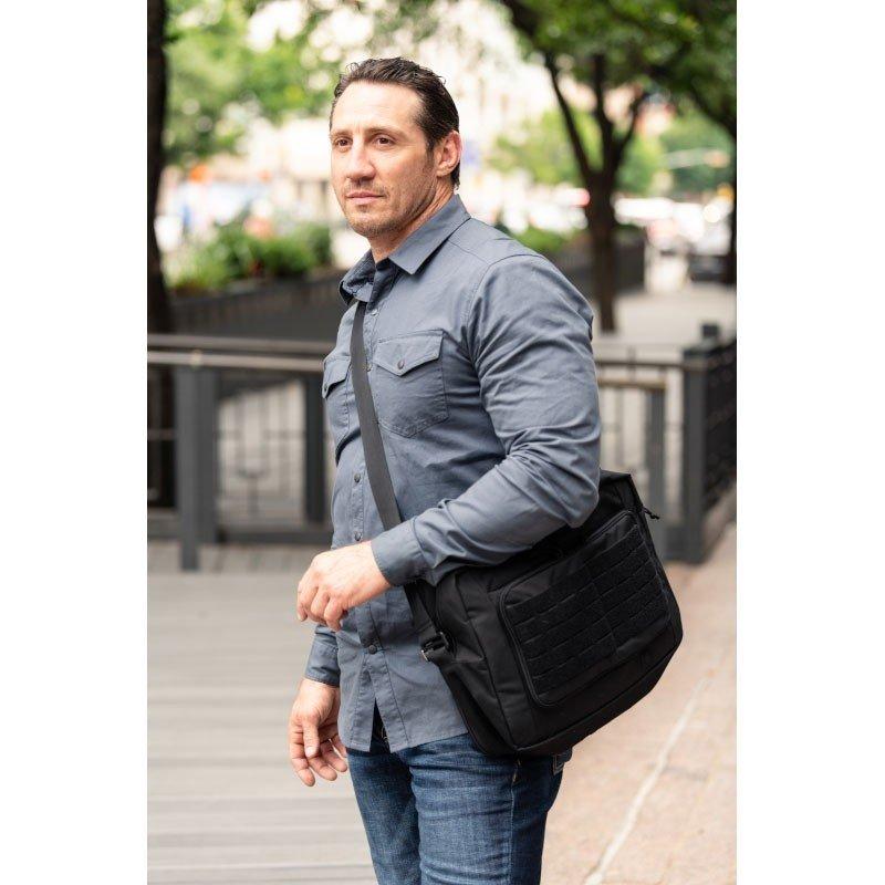 Un compartiment discret dédié CCW, muni d’un panneau autoagrippant compatible Velcro, accepte un holster ou une pouch selon les besoins. Une poche interne pour bouteille d’eau améliore l’équilibre de charge. Les bretelles de sac à dos escamotables, les poignées supérieures, la sangle latérale et la bandoulière matelassée amovible offrent plusieurs modes de portage pour adapter l’équipement au rythme de l’opération. Contenance 16 L, format 38 x 27,9 x 14,6 cm, masse 1250 g; l’absence de sangle de compression simplifie la silhouette et accélère l’extraction du contenu.