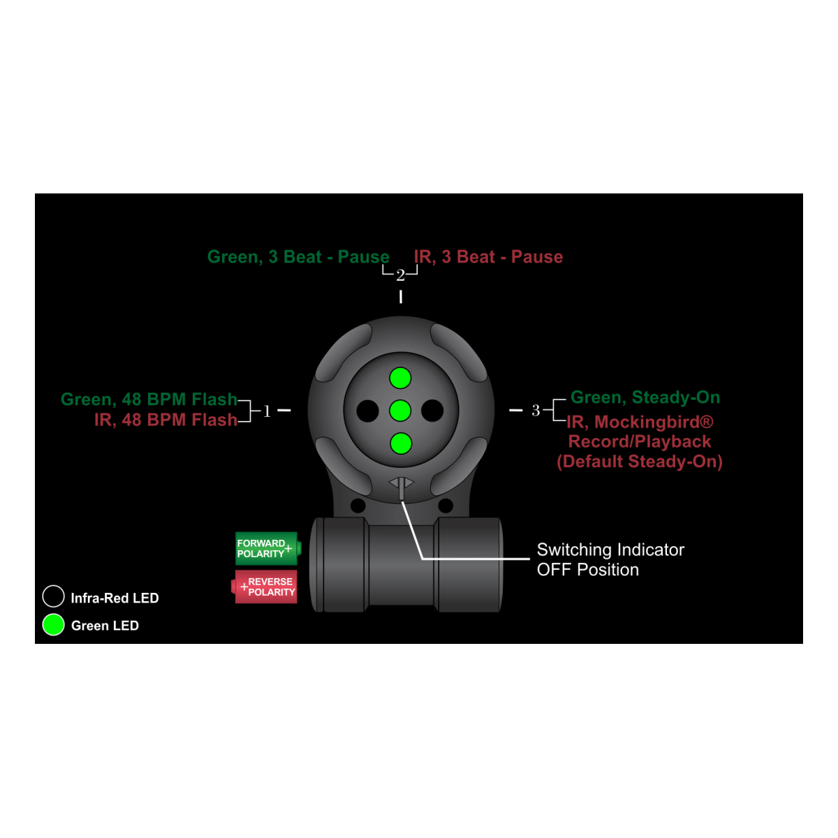Ce marqueur lumineux Adventure Lights assure des signaux visibles en vert et en infrarouge (IR) pour l’identification, la coordination et la sécurité en conditions exigeantes. La technologie Mockingbird® enregistre et lit des motifs personnalisés, tandis que le Reverse Polarity Program Switching® bascule les programmes par simple inversion de la pile, sans outil. Les modes disponibles couvrent 3 Beat - Pause, Steady-On, 48 BPM Flash et Enregistrement/Lecture, avec une portée visuelle jusqu’à 32 km de nuit pour un marquage précis, y compris en IR.