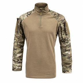 La Rogue VX taille normalement, avec une coupe ajustée pensée pour le port d'un porte-plaques par-dessus : pas de plis, pas de surépaisseur, longueur de buste suffisante pour rester rentrée dans le pantalon en mouvement. Les bras sont préformés pour suivre la position épaule en avant en posture de tir. Les poignets se règlent par bandes auto-agrippantes pour ajuster l'ouverture aux gants ou à la montre. Le col mao zippé sur quart de longueur protège la nuque sous le casque ou les sangles, et se relâche complètement à l'effort. Disponible en plusieurs tailles : se référer au sélecteur de taille sur la fiche.