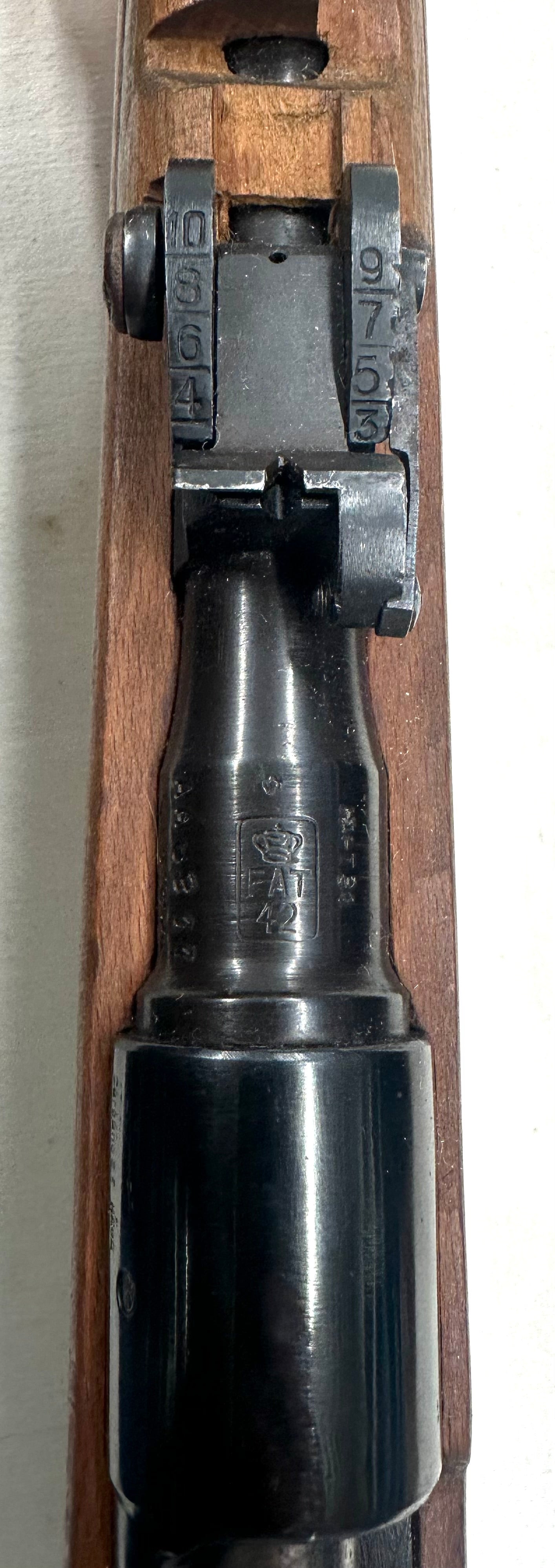 Magnifique fusil réglementaire Carcano 91/41 cal. 6.5x52. Superbe crosse en être avec très peu de traces d'usage mais une enture d’arsenal, fabrication, F.A.T. 1942 complet avec sa baguette, bronzage superbe, crosse et arme au même numéro, très beau canon bien brillant avec rayures bien profondes. Une arme superbe, idéale TAR ou collection. Arme éprouvée (poinçons d’épreuve allemands).