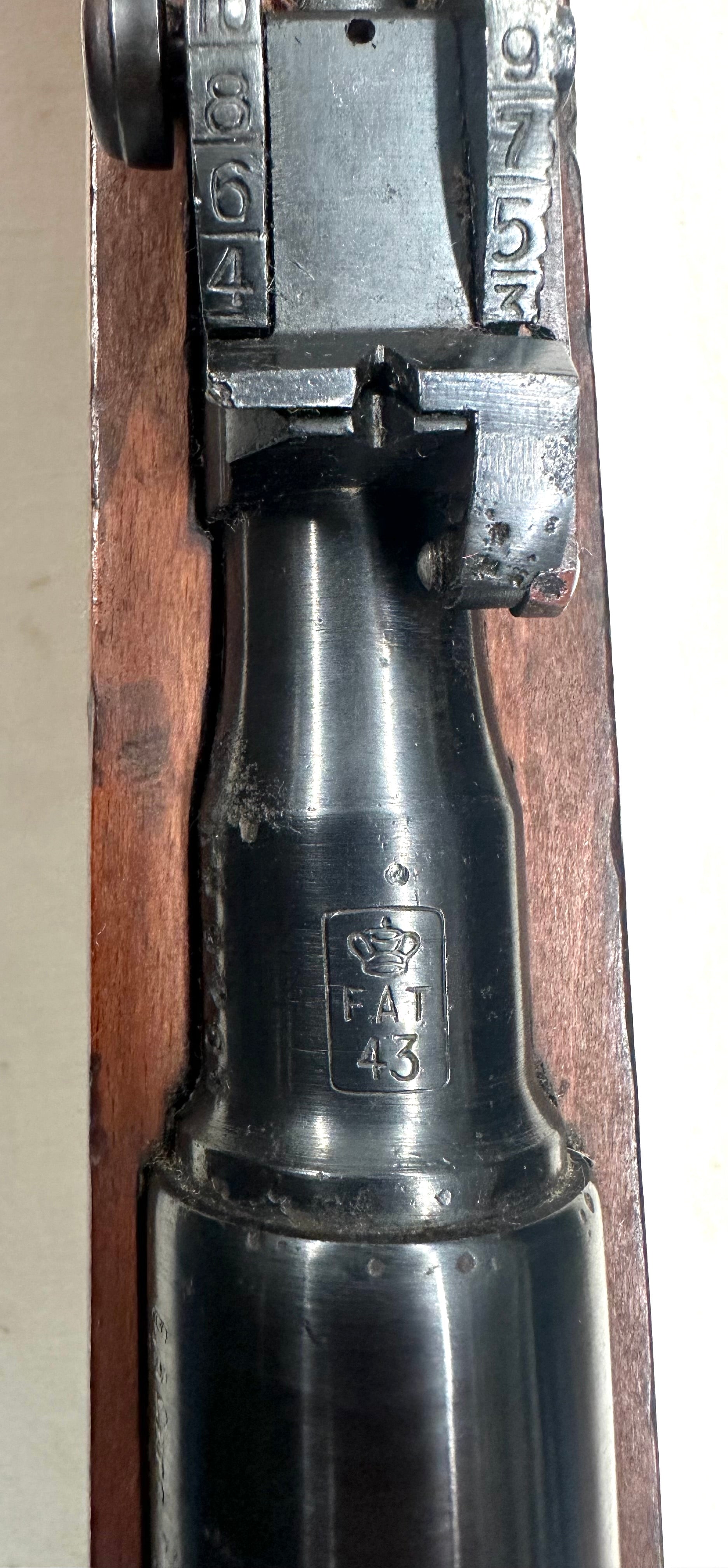 Très beau fusil réglementaire Carcano 91/41 cal. 6.5x52. Superbe crosse en être avec très peu de traces d'usage ce qui est rare, magnifique bronzage, fabrication, F.A.T. 1943 sans baguette, crosse et arme au même numéro, très beau canon bien brillant avec rayures bien profondes. Une arme superbe, idéale TAR ou collection. Arme éprouvée (poinçons d’épreuve allemands).