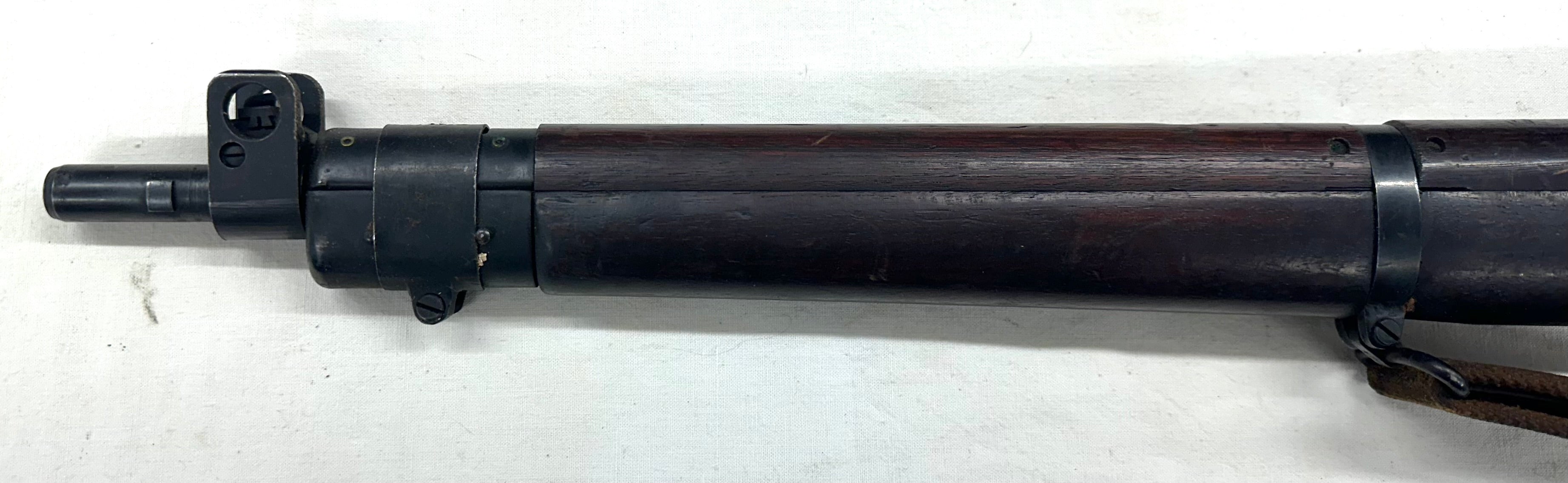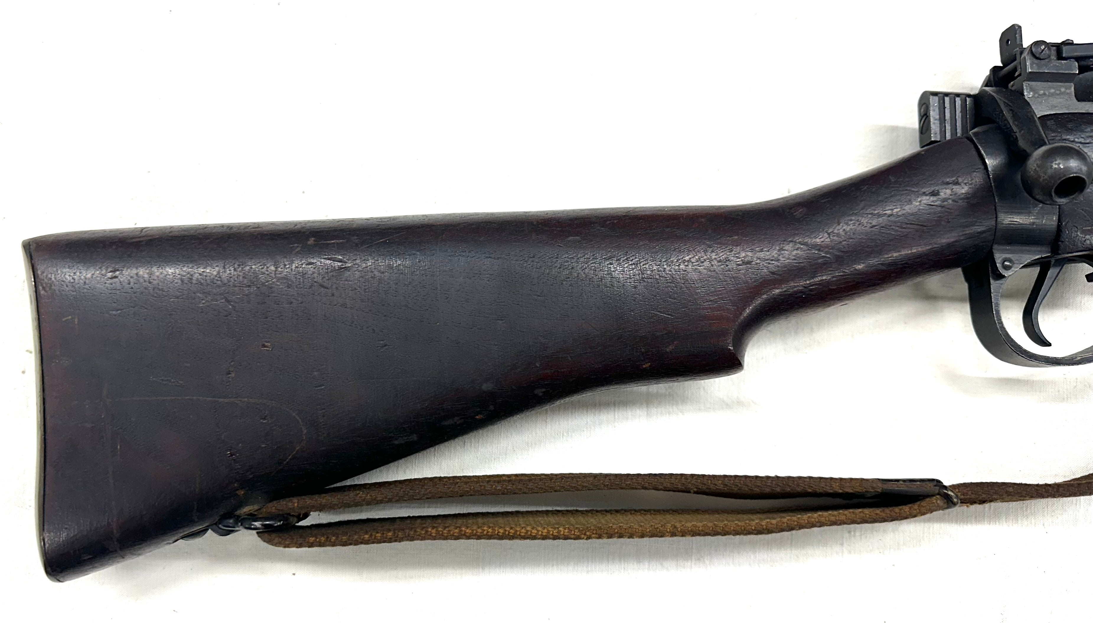 En tout cas cet exemplaire est en parfait état, avec un canon quasi miroir, un bronzage parfait, une crosse qui a très peu de marques et une hausse micrométrique du premier modèle. Le talon de crosse est en laiton. Culasse pas au numéro. Magasin absent. Fabrication Maltby de 1944. Aucun poinçon parasite. Avec sa bretelle d’origine.