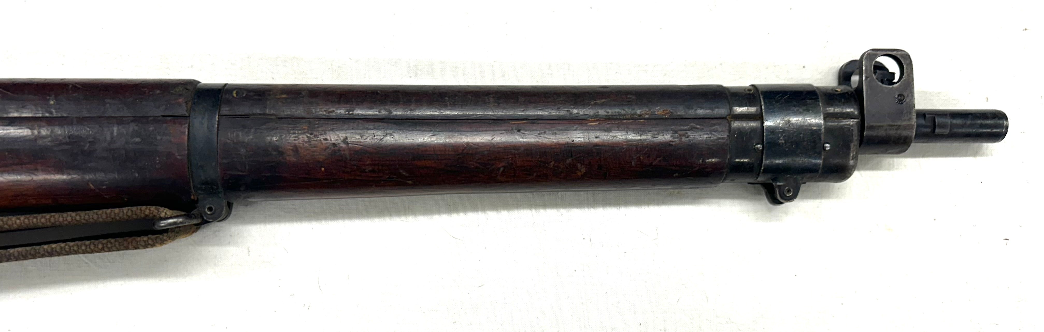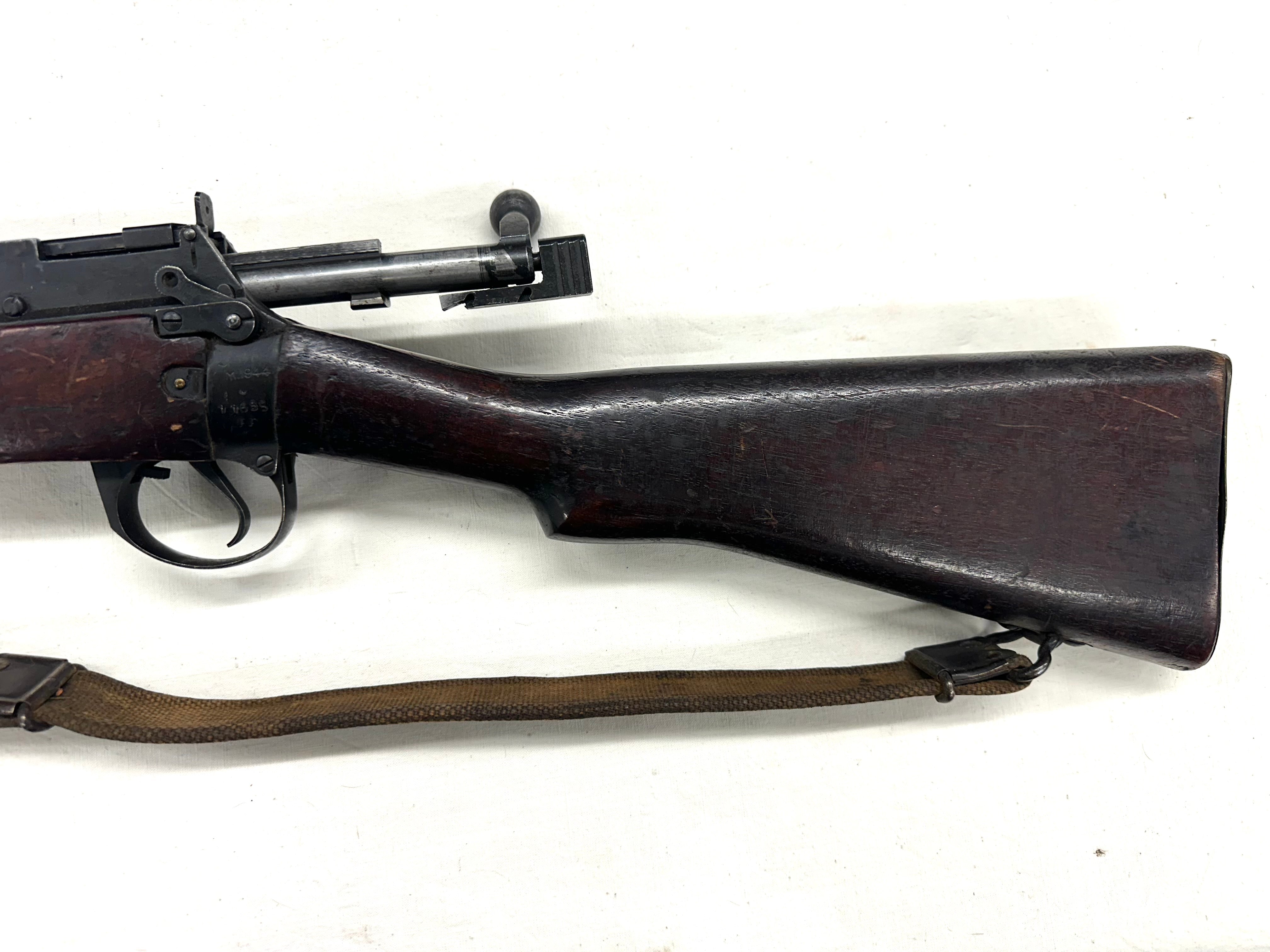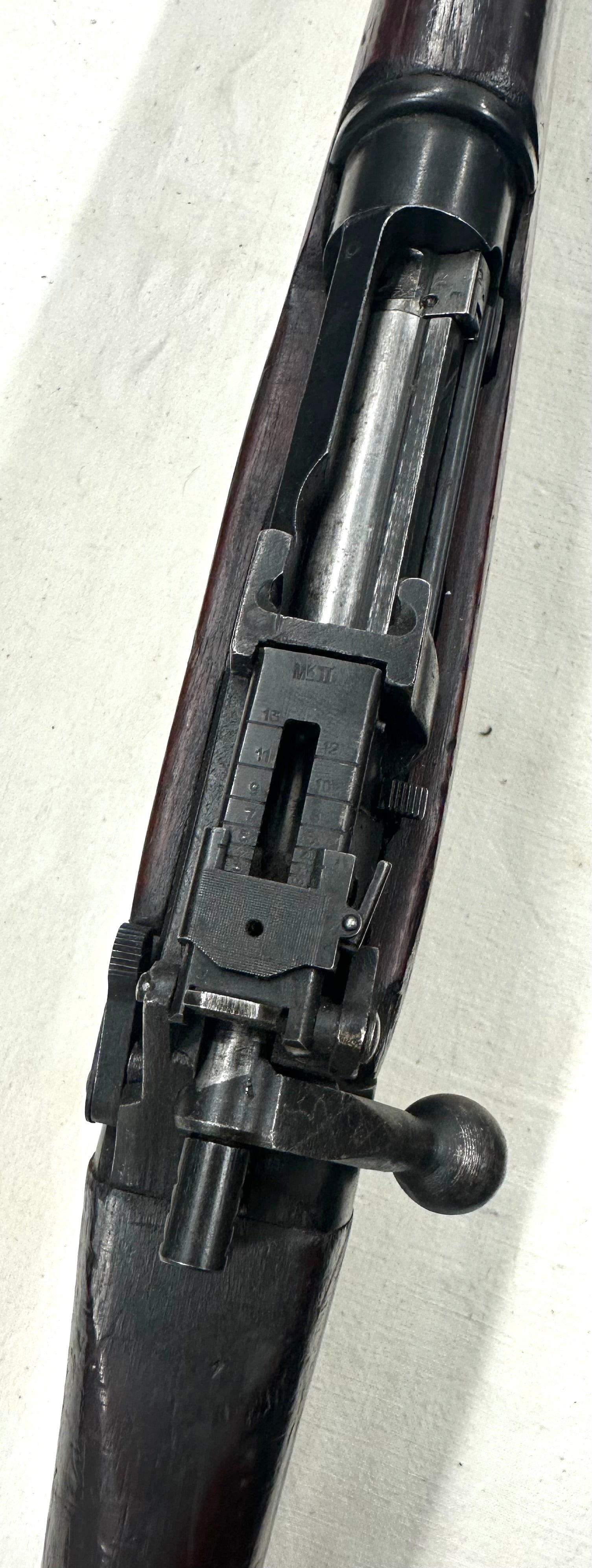 En tout cas cet exemplaire est en parfait état, avec un canon quasi miroir, un bronzage parfait, une crosse qui a très peu de marques et une hausse micrométrique du premier modèle. Le talon de crosse est en laiton. Culasse pas au numéro. Magasin absent. Particularité notable, le dessus du levier de culasse porte le double drapeau des transmissions (signal corps) gravé dans le bronzage. Fabrication Maltby de 1944. Avec sa bretelle d’origine. Aucun poinçon parasite.