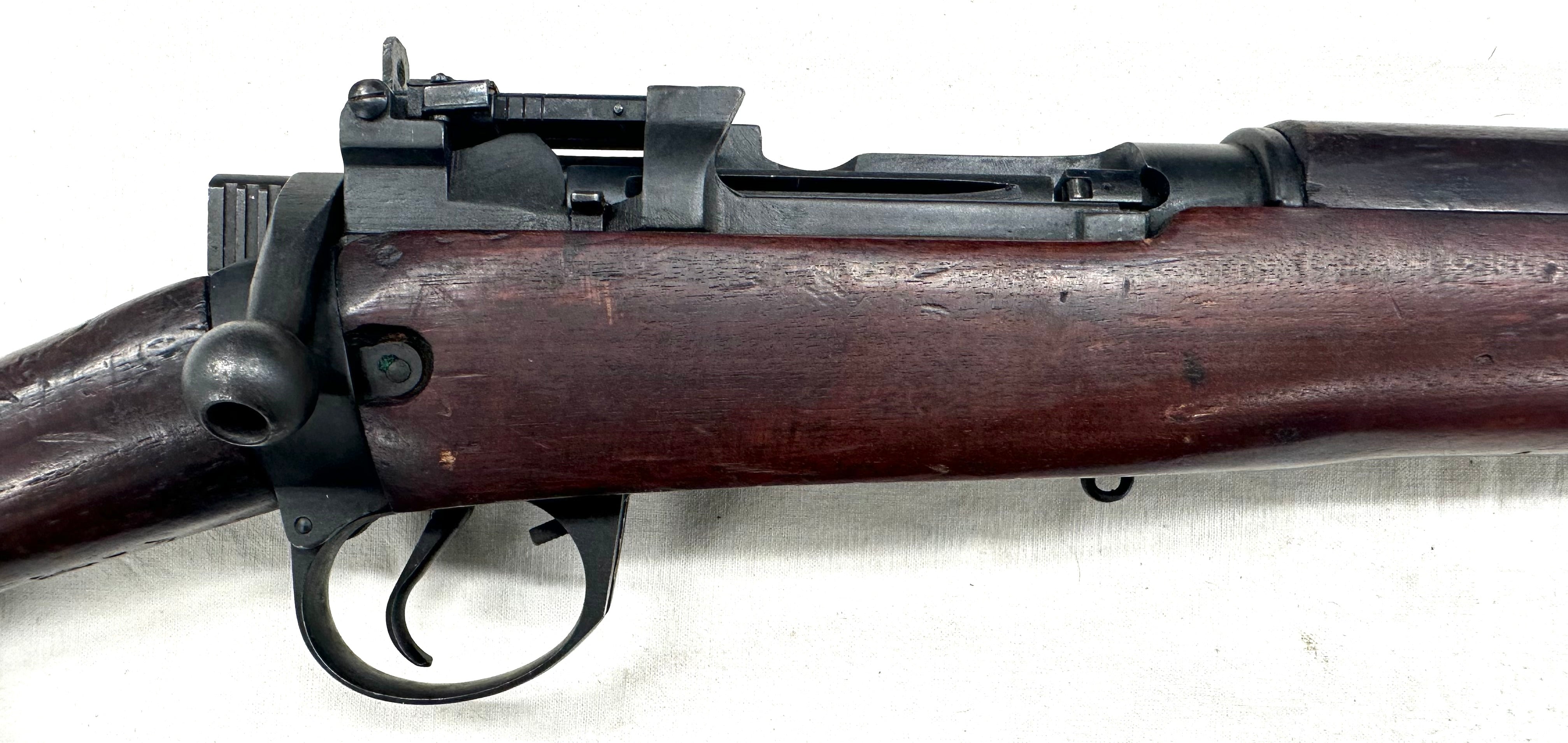 En tout cas cet exemplaire est en parfait état, avec un canon quasi miroir, un bronzage parfait, une crosse qui a très peu de marques et une hausse micrométrique du premier modèle. Le talon de crosse est en laiton. Culasse pas au numéro. Magasin absent. Fabrication Maltby de 1944. Aucun poinçon parasite.