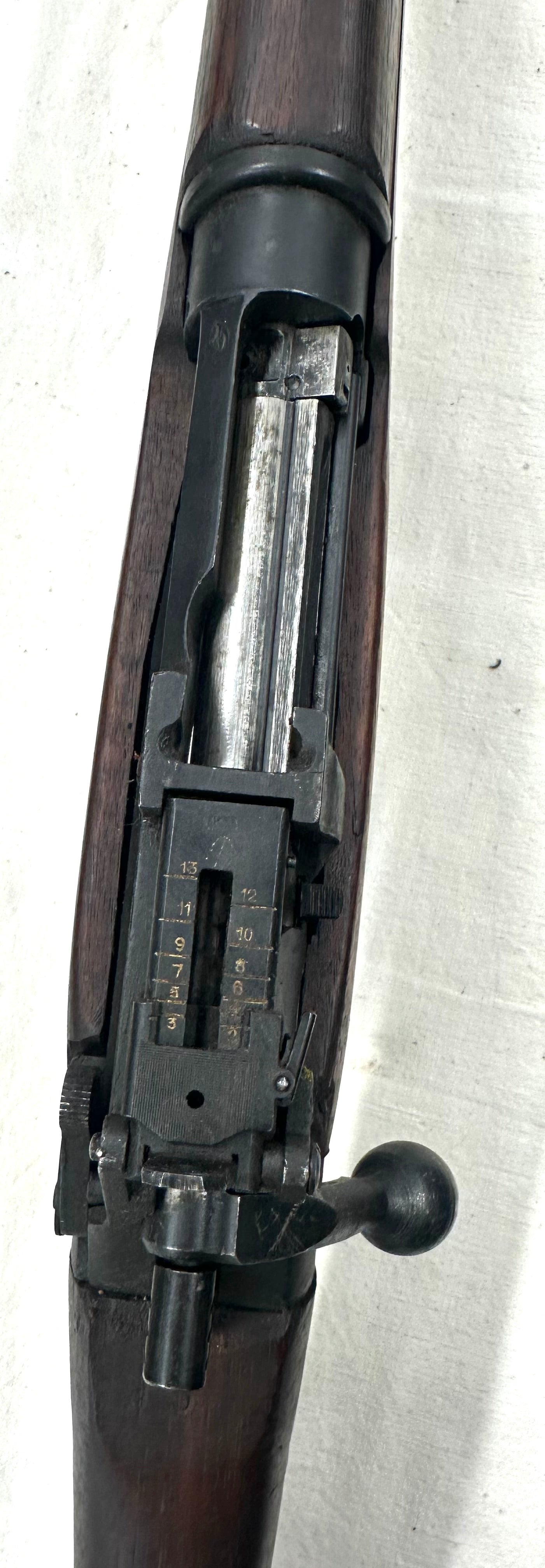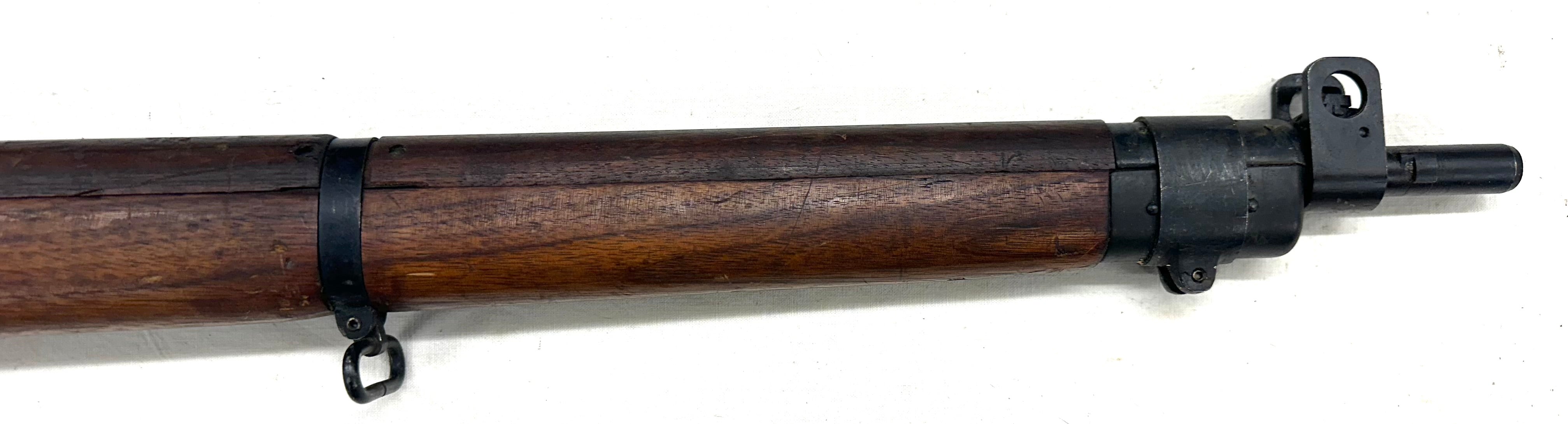 En tout cas cet exemplaire est en parfait état, avec un canon quasi miroir, un bronzage parfait, une crosse qui a très peu de marques et une hausse micrométrique du premier modèle. Le talon de crosse est en laiton. Culasse pas au numéro. Magasin absent. Particularité notable, le dessus du levier de culasse porte le double drapeau des transmissions (signal corps) gravé dans le bronzage. Fabrication Maltby de 1944. Aucun poinçon parasite.