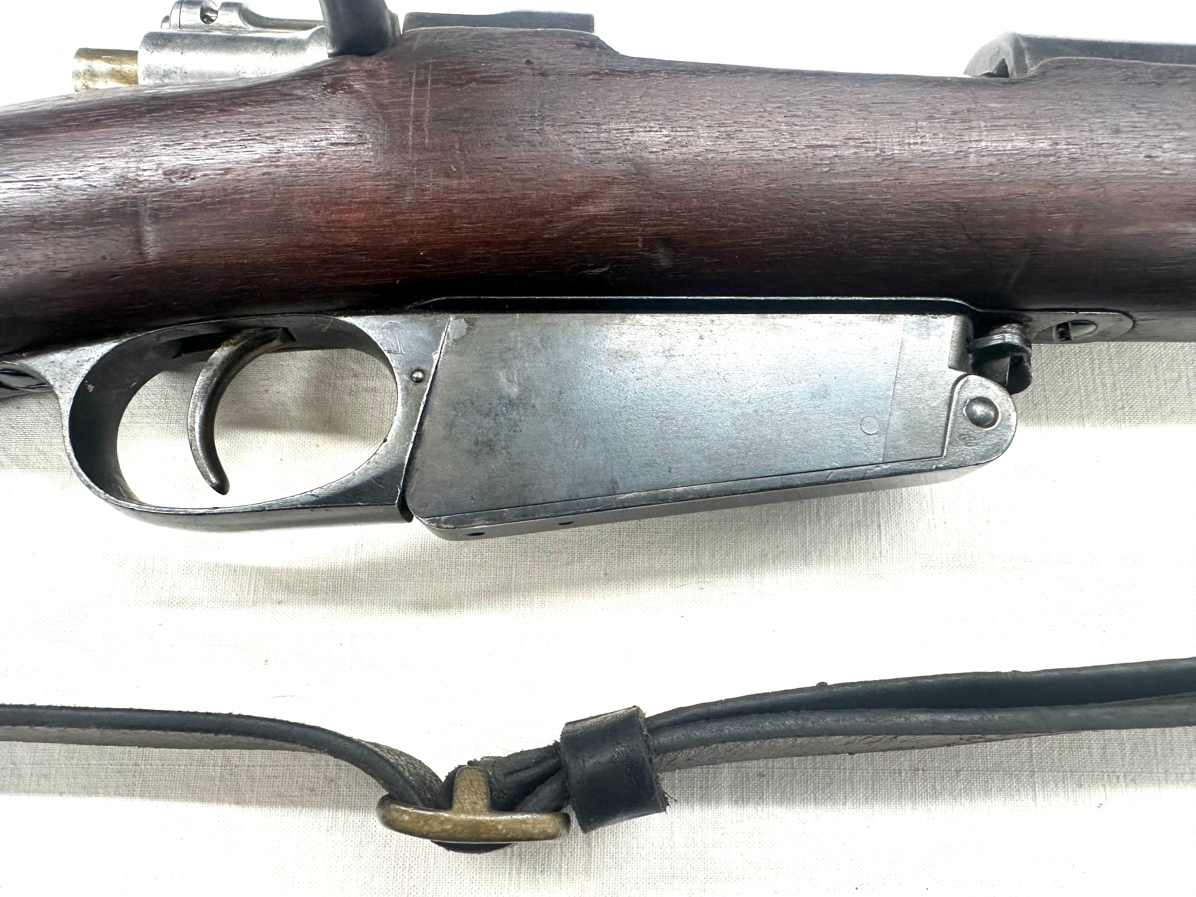 Bel exemplaire de fusil péruvien mle 1891, revendu par l’argentine et modifié en 1909 avec changement de hausse liée à l’adoption de cartouches à balles pointues. Arme en très bon état, calibre 7.65x53, beau canon bien brillant avec de très belles rayures, bronzage noir à 90% (et d’origine semble-t-il), belle crosse avec peu de traces d’usures. Vendue avec sa bretelle d’origine. Fabrication DWM à Berlin. Armoiries péruvienne encore légèrement visible sur le tonnerre (elles ont en général été complètement effacées lors du changement de hausse…) Une très belle pièce pour le TAR ou la collection. Aucun poinçon parasite.