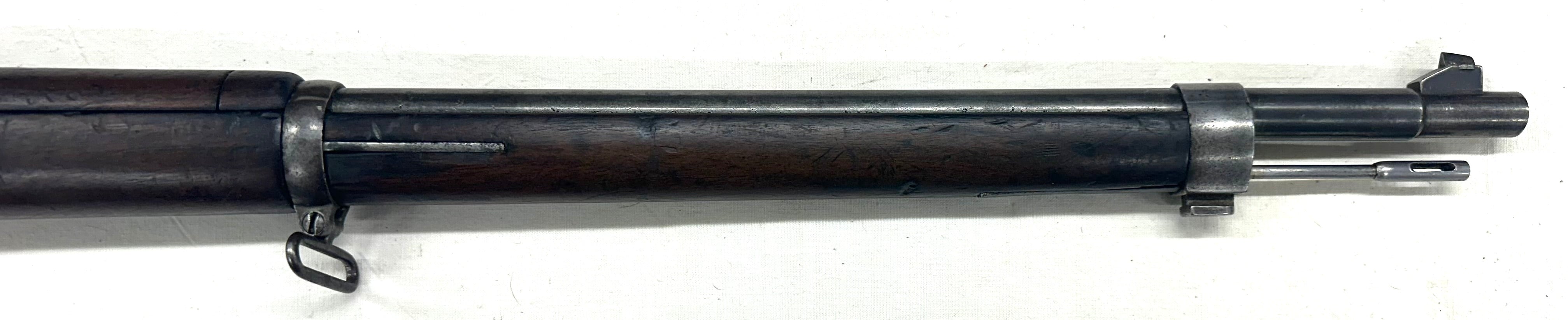 Bel exemplaire de fusil péruvien mle 1891, revendu par l’argentine et modifié en 1909 avec changement de hausse liée à l’adoption de cartouches à balles pointues. Arme en très bon état, calibre 7.65x53, beau canon de fabrication suisse SIG bien brillant avec de très belles rayures, bronzage noir à 50%, belle crosse avec traces d’usurage. Fabrication DWM à Berlin. Armoiries péruvienne bien visible sur le tonnerre (elles ont en général été complètement effacées lors du changement de hausse…) Une très belle pièce pour le TAR ou la collection. Arme éprouvée (poinçons d’épreuve allemands).