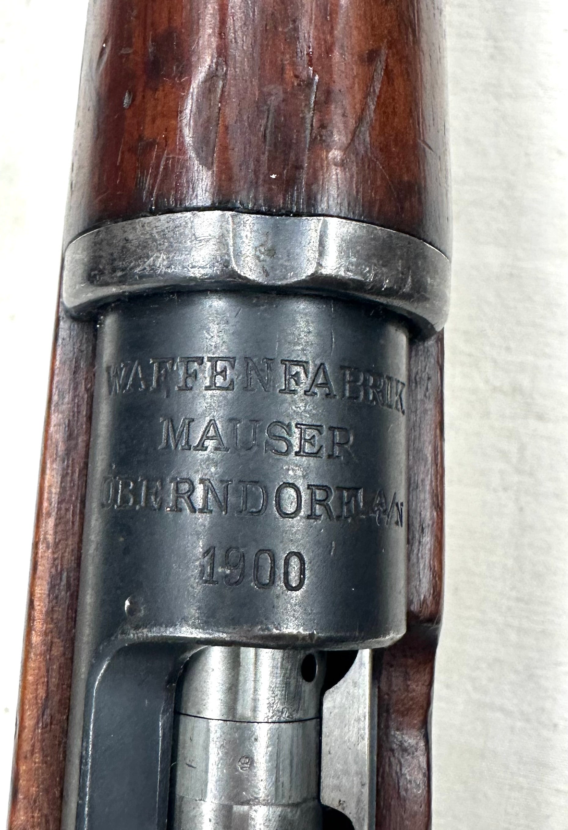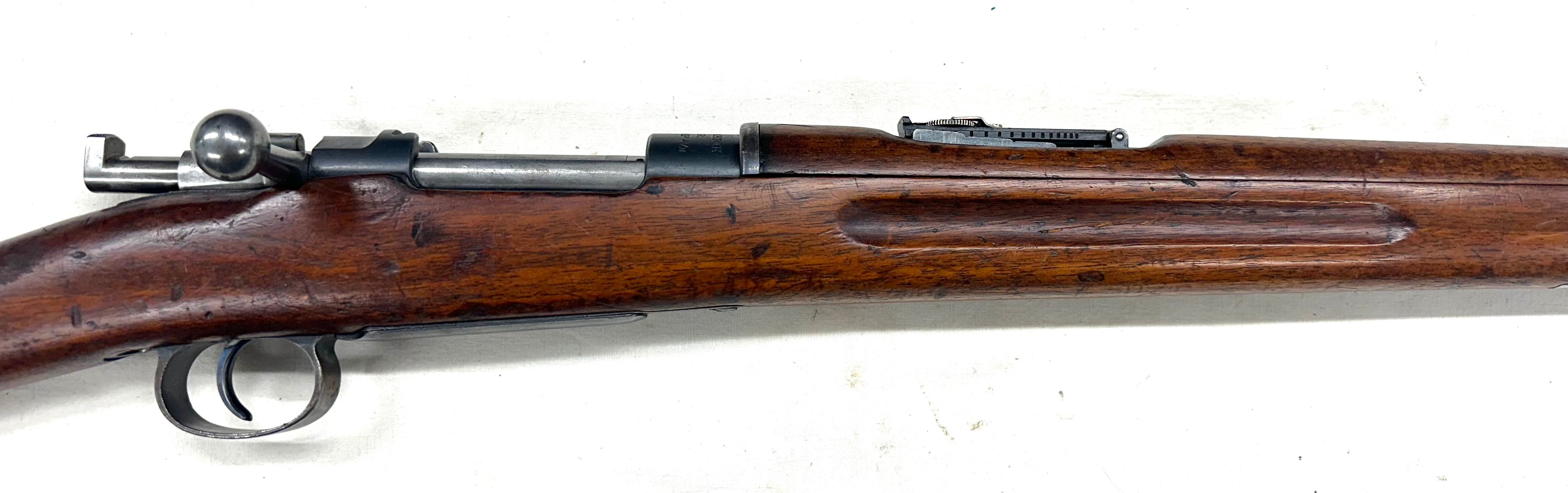 Très beau fusil Mauser M96-38 suédois, chambré en calibre d’origine 6.5x55, fabrication Mauser Oberndorf de 1900, modifié évidemment après 1938 (d’où le levier de culasse droit), en très bon état état, belle crosse avec traces de manipulation, très beau bronzage à 80-90%, possède sa baguette d’origine. Monomatricule, canon bien brillant avec de belles rayures. Une très belle arme pour le TAR ou la collection. Arme éprouvée (poinçons d’épreuve allemands).