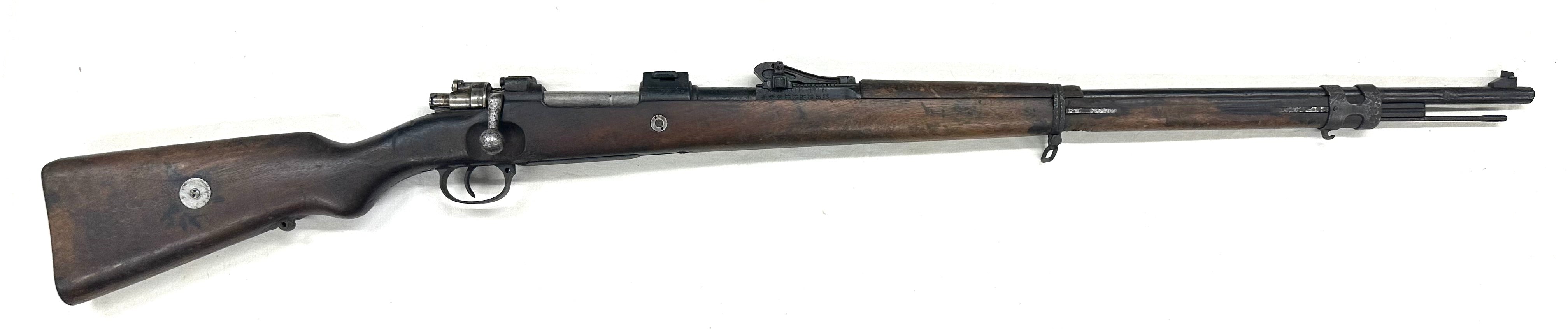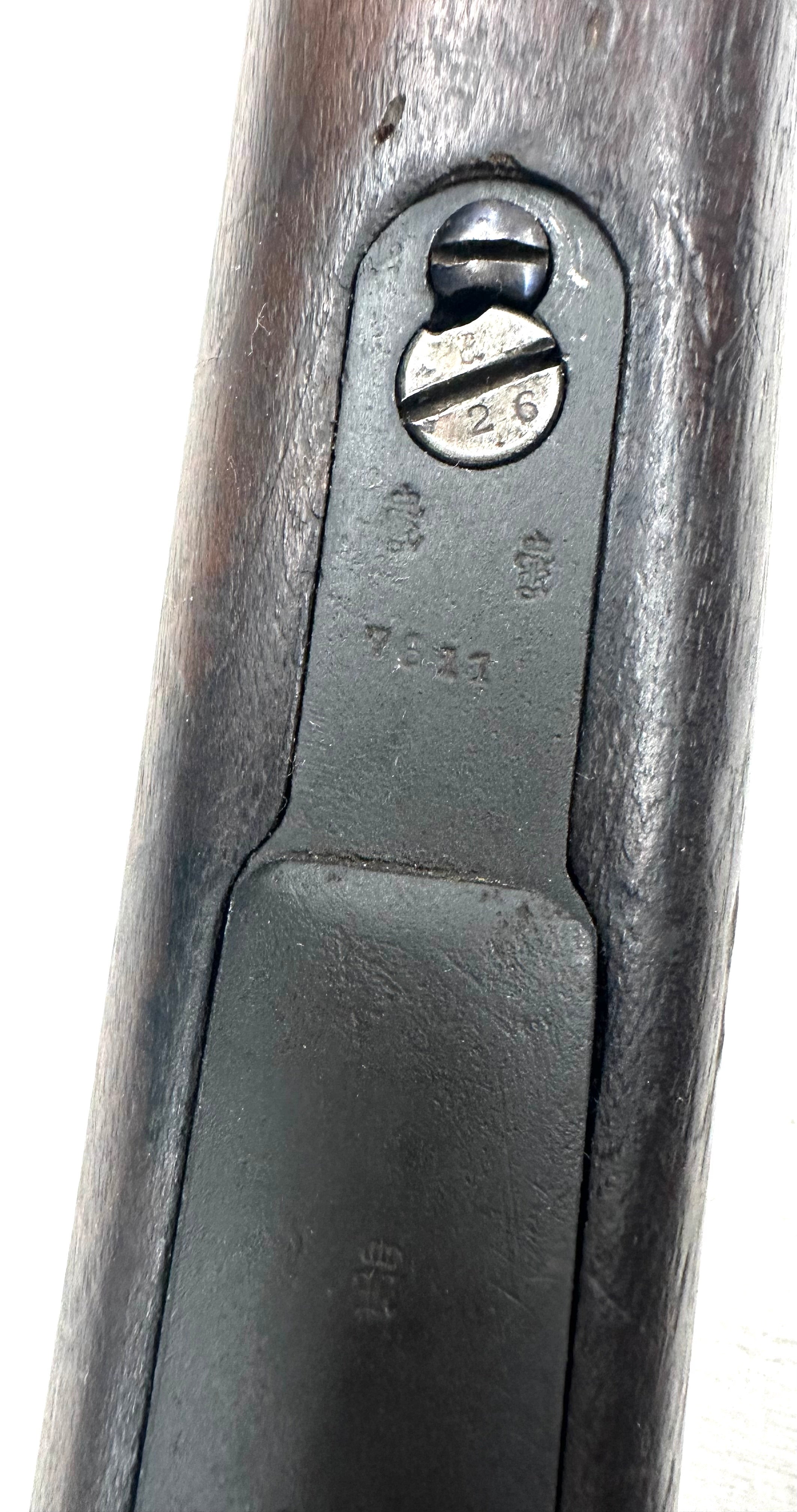 Rare fusil Mauser G98 dans son état de découverte, entièrement monomatricule sauf les vis, fabrication avec montage sniper. Culasse coudée au numéro. Il a été rebronzé, mais présente l’avantage d’être 100% d’origine (voir photos). Le canon est gris mais les rayures sont bien profondes, à nettoyer comme le reste de l’arme. La crosse est au numéro et comporte des traces de manipulation. Aucun poinçons parasites. Une arme rare à trouver de nos jours.