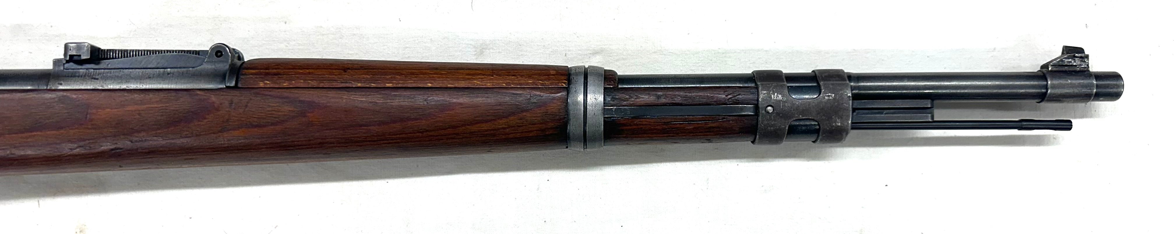 Superbe fusil Mauser 98K Preduzece 44, reconstruit en Yougoslavie après guerre à partir de pièces de Mauser. Crosse en lamellé collé (colle rouge) en bel état avec très peu de marques, bronzage gris, passé par endroit, beau canon avec de très belles rayures, très beau blason yougoslave sur le tonnerre. Baguette de nettoyage présente. Une très belle pièce pour le TAR ou la collection. Arme éprouvée (poinçons d’épreuve allemands).