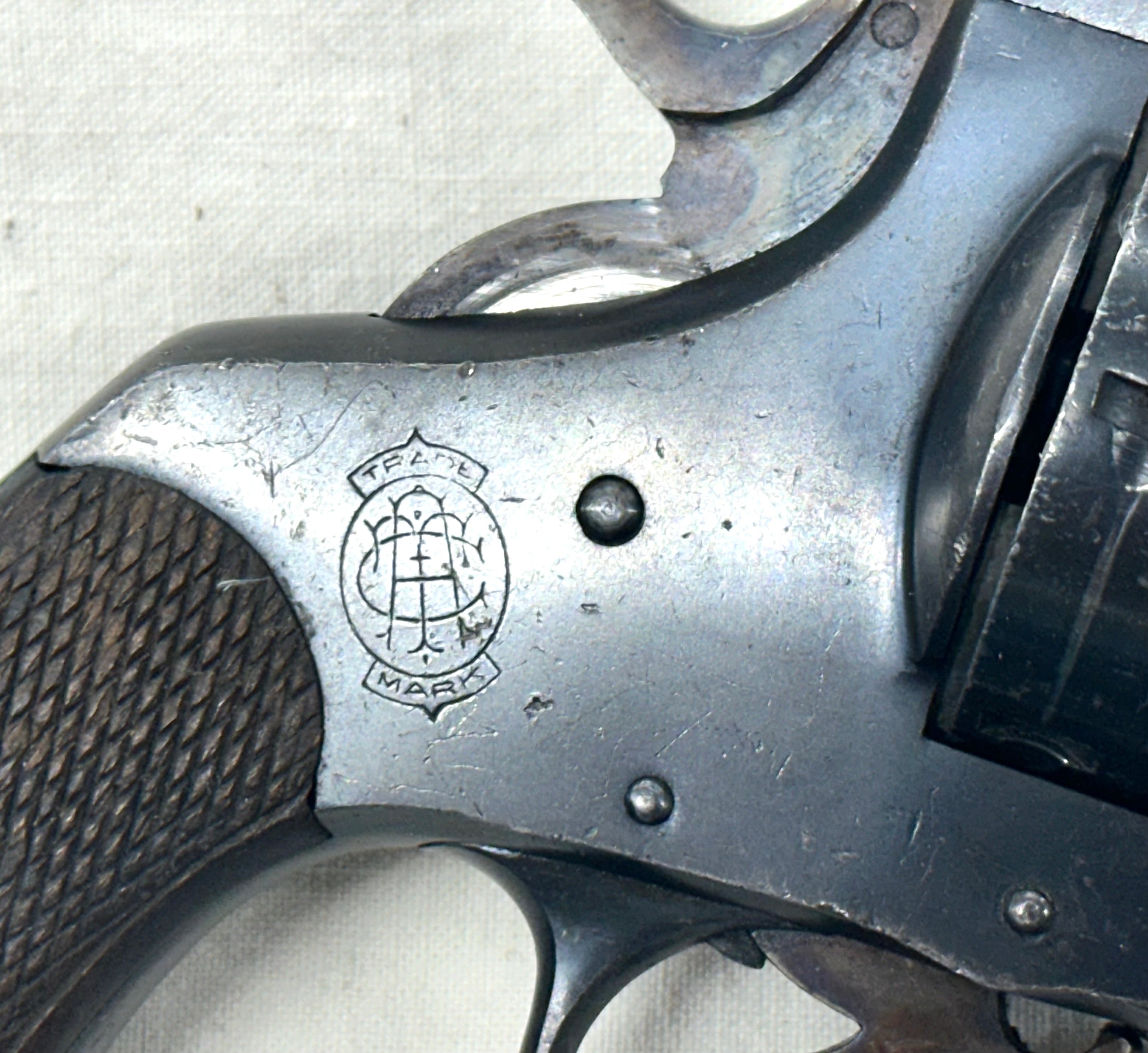 Fabriqué pour l'armée britannique, basé sur les Revolvers à brisure type Smith & Wesson en calibre .455 Webley, très beau canon proche du miroir, plaquettes bois en bon état, bronzage et finitions d'origine à 85-90%