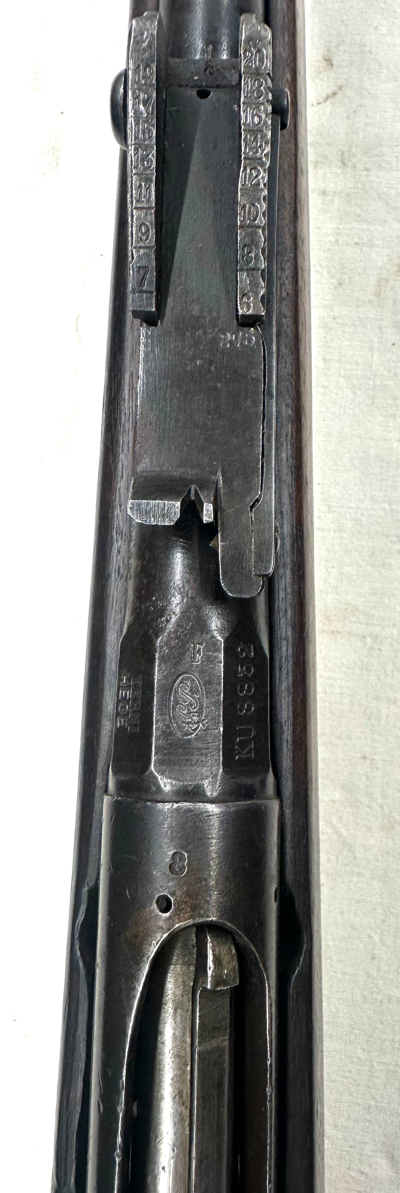Beau fusil typique de la grande guerre, qui a forcé les Italiens à faire feu de tout bois et donc a transformer les vénérables Vetterli 70/87 en 6.5x51. Bien que destinés à être utilisé à l’arrière ces armes ont vu les combats à de nombreuses occasions. L’exemplaire que nous vous proposons est en très bon état, le Vetterli d’origine date de 1889 et a été fabriqué à Terni. Crosse avec peu de traces de coups, bronzage d’origine à 50-60%, fonctionnement impeccable. Beau macaron de crosse daté 1917, arme au numéro. Beau canon bien brillant avec de belles rayures. Arme éprouvée (poinçons d’épreuve allemands). Une arme historique classée en D.